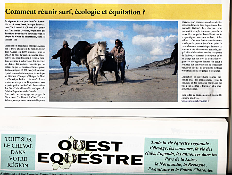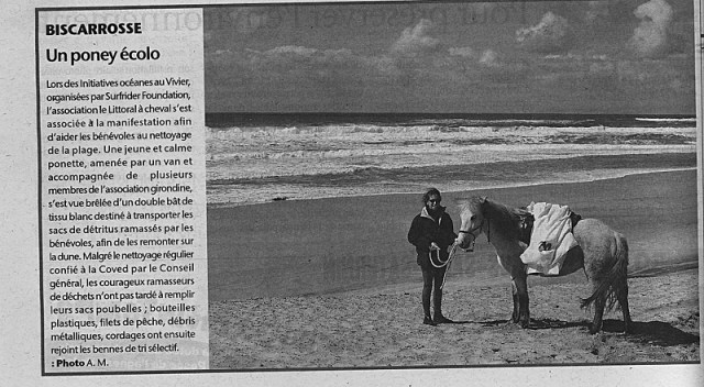 Pour la seconde année consécutive en collaboration avec l’association de surfeurs SurfRider Foundation, les membres de l’association Le Littoral à Cheval ont mis cette fois-ci quatre de leurs montures à contribution pour aider à ramasser les ordures sur les plages de Biscarrosse dans le cadre des Initiatives Océanes…