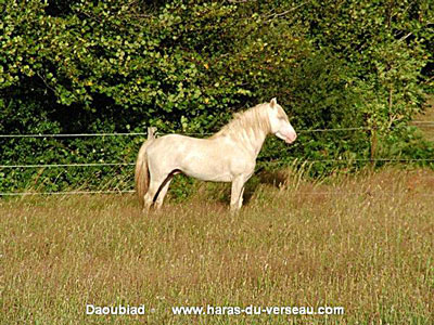 Selon la couleur de la jument, avec un père perlino, il est possible de prévoir la robe du poulain… voir la page Génétique Sa descendance laisse présager la présence d’un gène gris, ce qui veut dire que le poulain a une chance sur deux de grisonner.