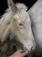 Il est peut-être cremello sooty, une analyse génétique confirmera sa couleur. Il est possible qu’il ait pris le gène roan de sa mère (croupe blanche).