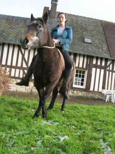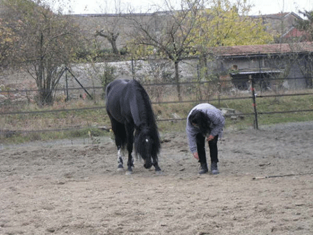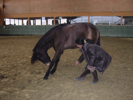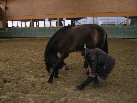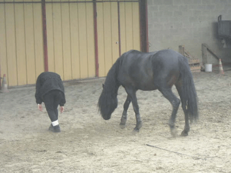 J’imite d’abord le cheval, sur des gestes simples, qui m’intéressent… Au bout d’un moment, il se rend compte de ce que je fais (j’imite et je félicite) et ensuite seulement, je “prends la main” , en faisant un mouvement en premier, pour que lui le fasse. Cela permet de lui faire comprendre que mes jambes correspondent à ses antérieurs, mon buste à son encolure etc…