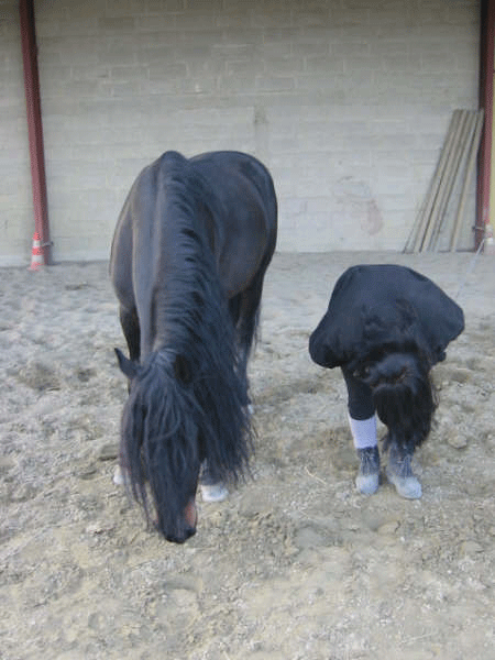 Contrairement à ce qui est préconisé dans la plupart des ouvrages qui enseignent des “tours”, nous ne ferons pas descendre la tête du cheval entre ses jambes grâce à une friandise mais nous demanderons à ce qu’il nous imite.