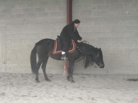 Cet exercice est intéressant à bien des titres. Ce sera le début du pas espagnol. Il permet également quand on selle, d’éviter les plis de peau sous la sangle. Monté, on peut vérifier aussi que le cheval est bien équilibré etc…