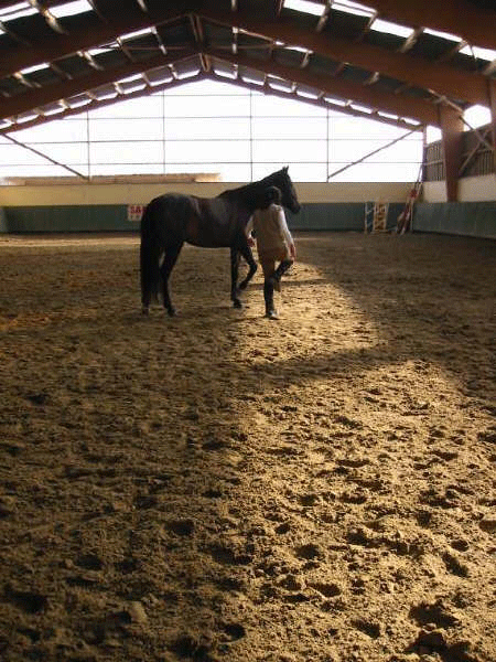 On peut ensuite demander à ce que le cheval baisse la tête quand il est sur le cercle et que l’on travaille en liberté et il comprend même ce mouvement quand on est dessus… Là, je le félicite en lui gratouillant le garrot, il l’a fait à l’arrêt.